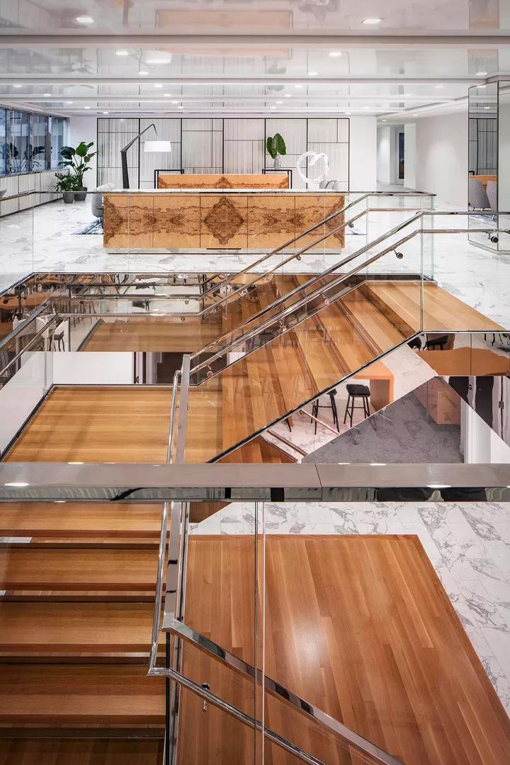 室內(nèi)裝修以通透的玻璃來制作隔墻,利于光和視線的穿透。黃褐色樹瘤橡木飾面板制作的接待前臺(tái)也是本案的一大看點(diǎn),均衡對(duì)稱的蝴蝶紋樣的木紋圖形帶來戲劇化的視覺效果,猶如一張代表公司形象的藝術(shù)名片,令人為之驚嘆。
